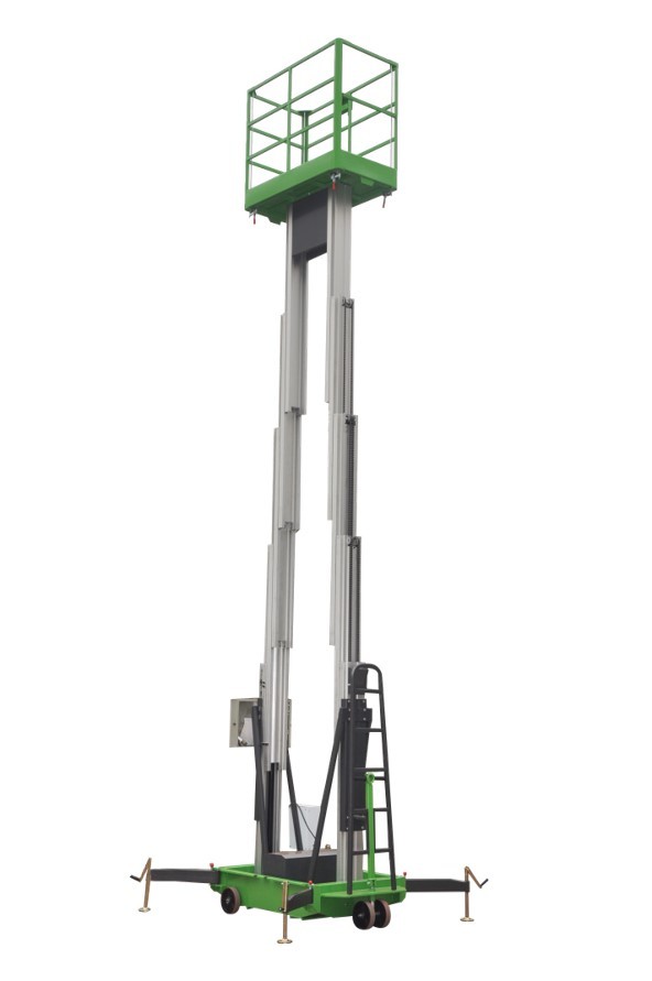Đôi Platforms Mast nhôm trên không làm việc có trọng lượng nhẹ, vì vậy mọi người có thể di chuyển nó dễ dàng. Bạn không thể nhấc máy nếu máy không có trong một bức tượng horizonal và chân chống cần phải được mở hoàn toàn.