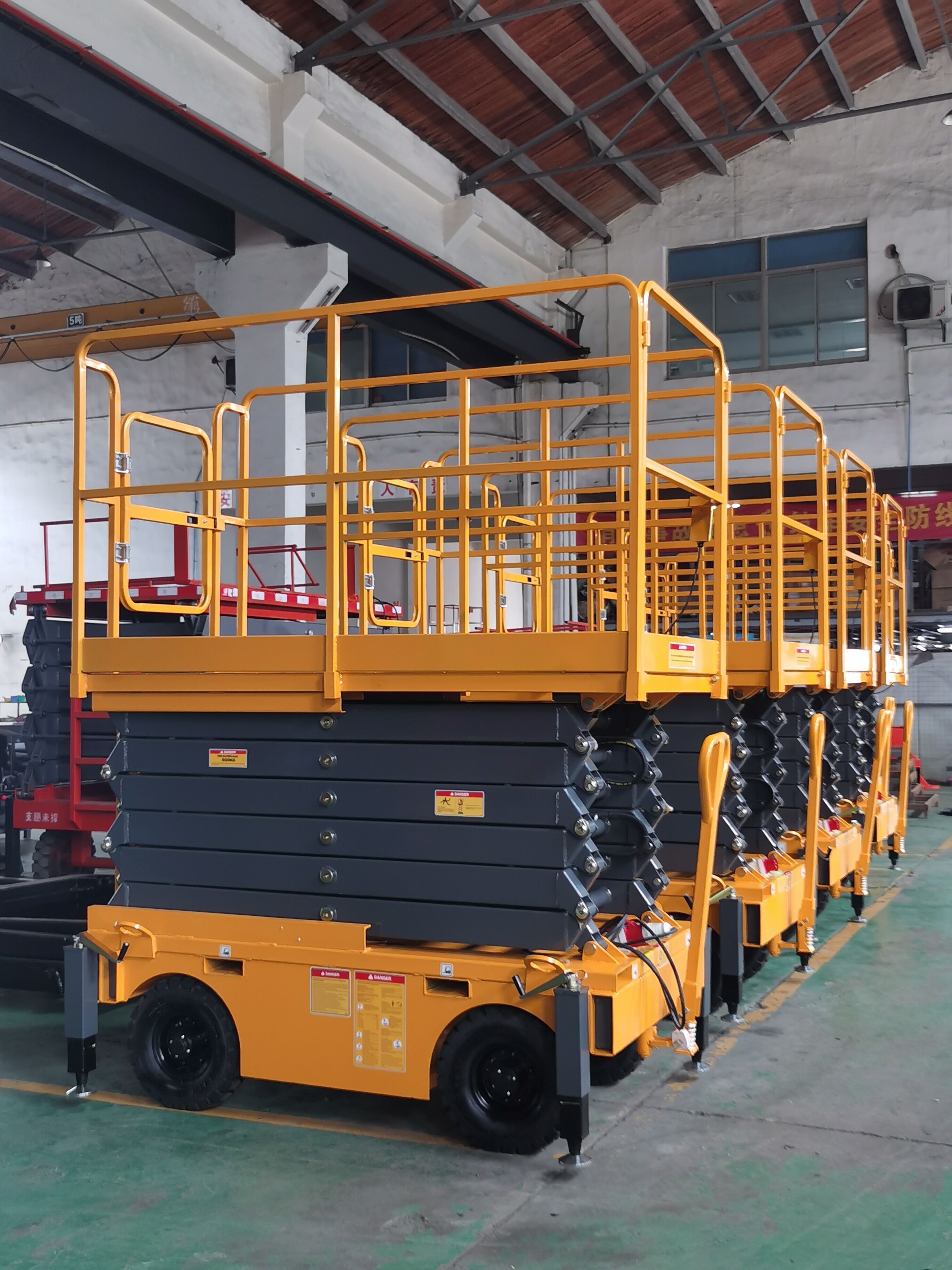 Our mobile scissor lift can be chosen height from 4m to 18m,It can move in a variety of ways:hand push, pull-type, self-style and vehicle-mounted style.The removable type guardrail, can reduce the storage space, convenient in and out of the places where highly restricted.It is assembled with emergency stop button,the platform will slowly down when press the button in an emergency occasion.This kind of scissor lift can reduce your investment cost, improve work efficiency and ensure the safety of your work.